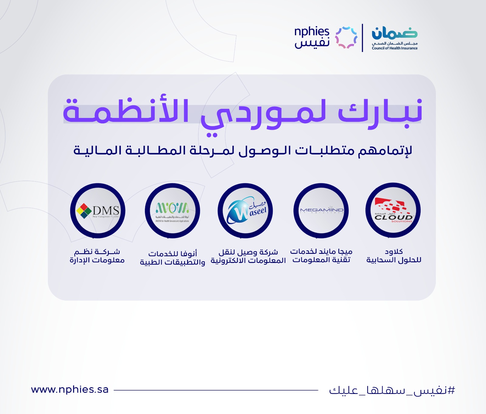 في إطار التحول الرقمي للقطاع الصحي في المملكة العربية السعودية و تحقيقًا لإحدى أهداف رؤية المملكة ٢٠٣٠ ، يقوم المجلس بالعمل على منصة نفيس بالتعاون مع المركز الوطني للمعلومات الصحية، و هي منصة تعنى بتسهيل تبادل المعلومات . الصحية للمرضى و مشاركة البيانات المالية و الإدارية والتي ستوفر الرؤية و الشفافية لجميع المستفيدين